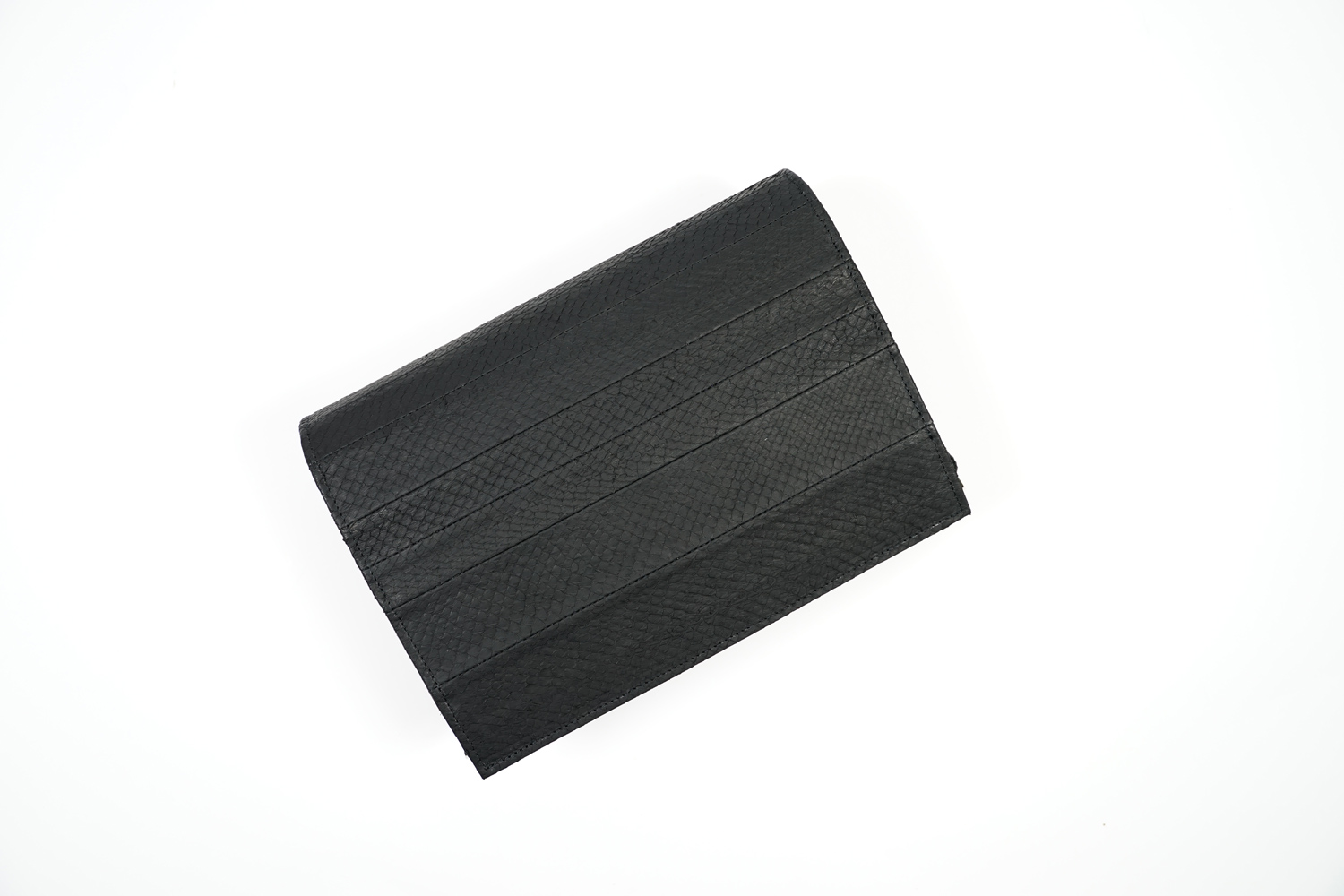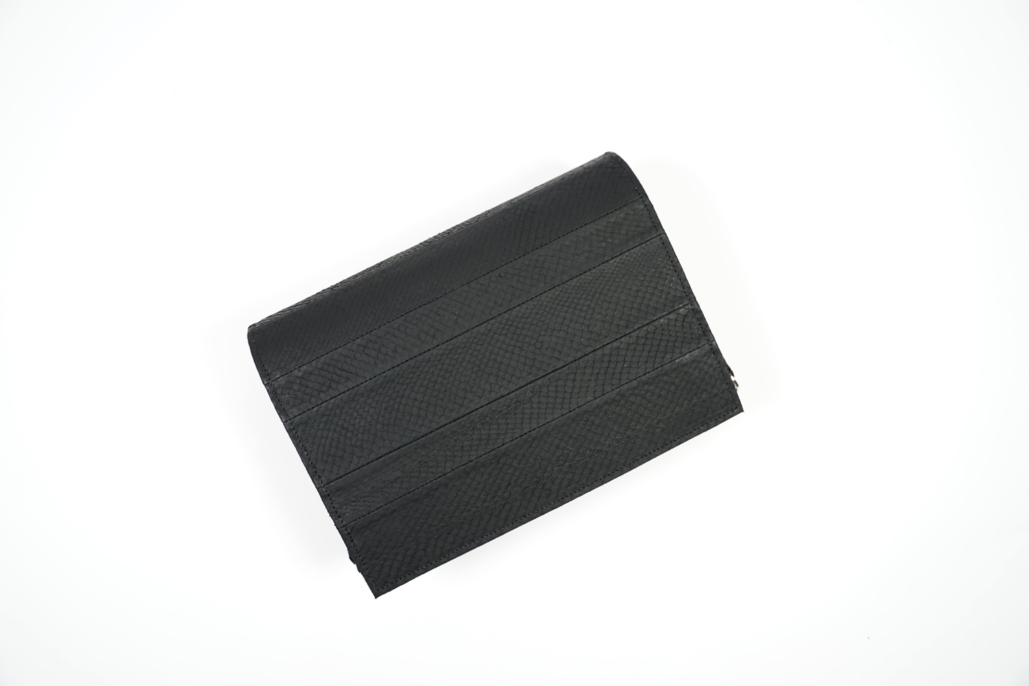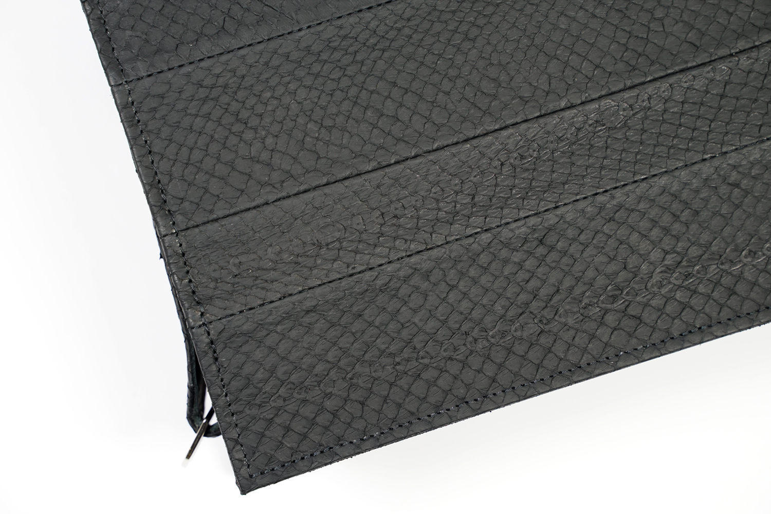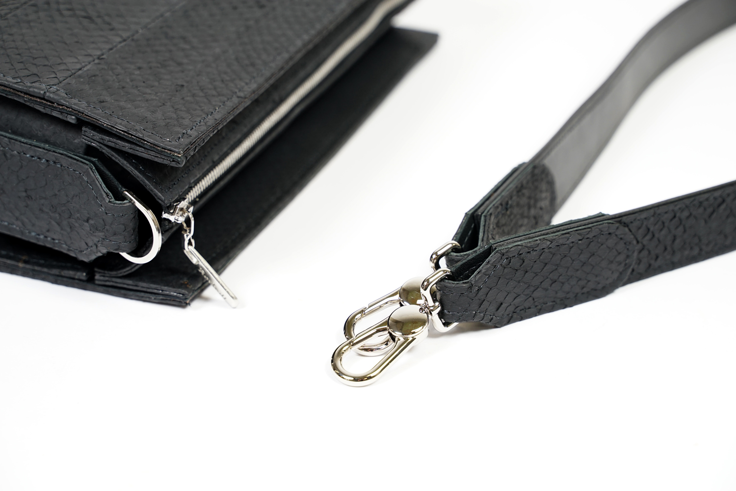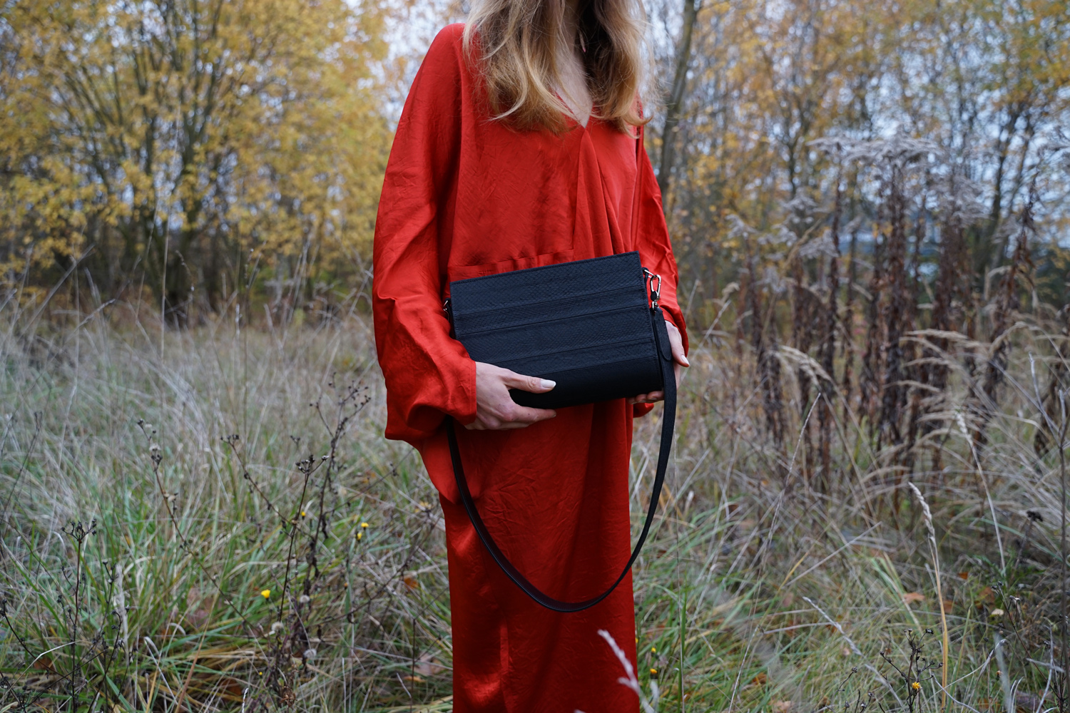 Die Handtasche Elvogar setzen wir aus zahlreichen, unterschiedlich breiten Streifen feinster isländischer Lachsleder zusammen, was ihr einen geometrischen und klaren Charakter verleiht. Für diese Version haben wir uns für ein tief mattes Schwarz entschieden. Durch ihren abgerundeten Boden liegt sie wie selbstverständlich in der Hand. Ihr Format nimmt alle Daily Essentials auf und auch für ein Buch ist noch Platz. Der breite Trageburt macht Elvorgar zusätzlich alltagstauglich ohne zu wuchtig zu sein. Er lässt sich an- und ablegen, wodurch Sie die Tasche noch feiner an Ihren Look und Anlass anpassen können.